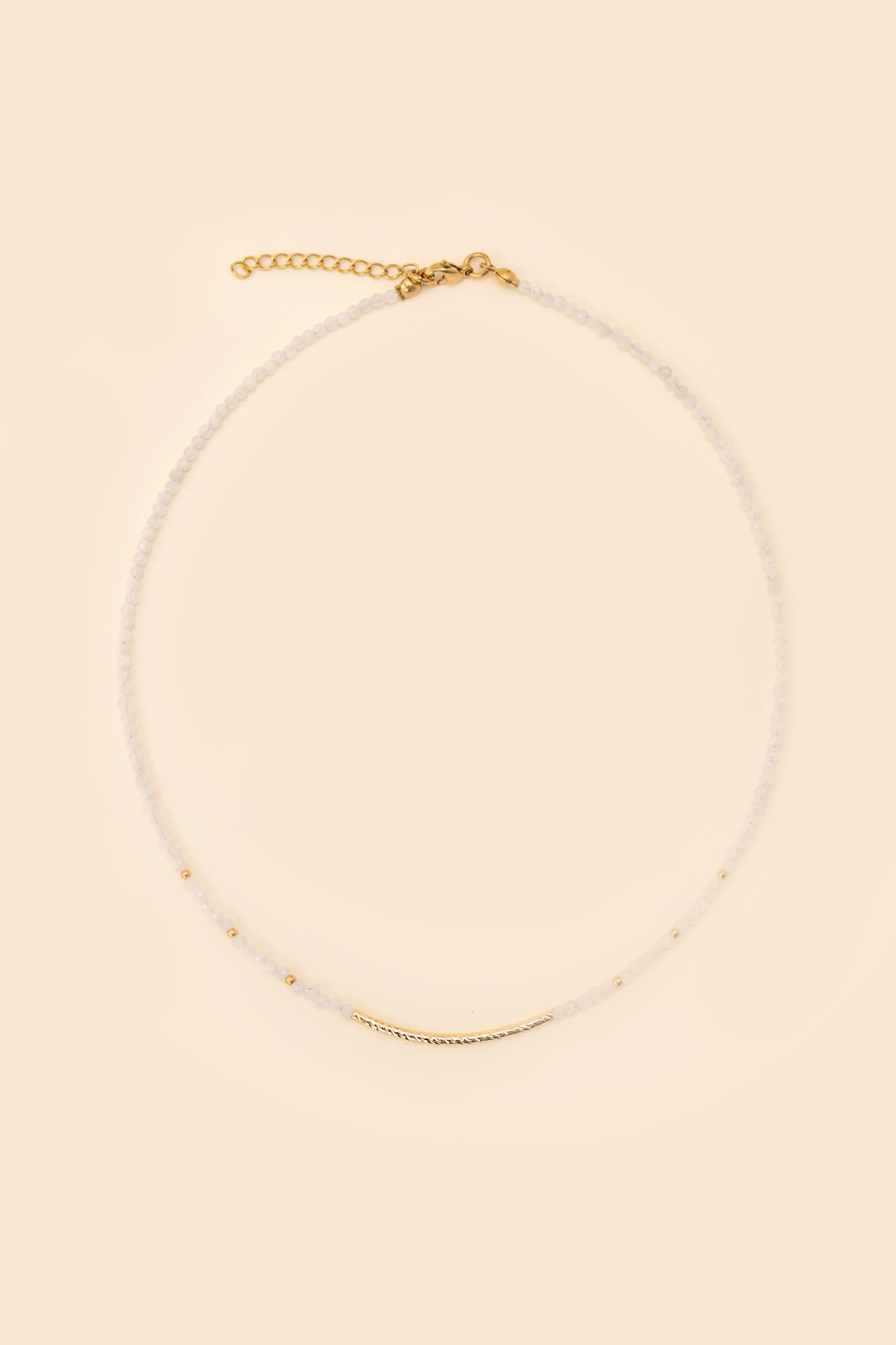 Naszyjnik wykonany z kamienia księżycowego, całość została wykończona pozłacaną stalą szlachetną najwyższej jakości, która nie uczula i nie ciemnieje nawet podczas kontaktu z wodą. Długość całkowita: 38 cm + 5 cm przedłużki. Istnieje możliwość wydłużenia chokera o kilka centymetrów. Wystarczy dodać komentarz do zamówienia. Wielkość kamienia: około 3 mm Kamień księżycowy pomaga w pełni zrozumieć siebie. Skumulowana w nim moc łagodzi i dobrze wpływa na emocje, wspiera intuicję i kreatywność. Posiada działanie ochronne. Biżuteria pakowana jest w ekologiczne pudełeczko ze złotym logo Kahiko.